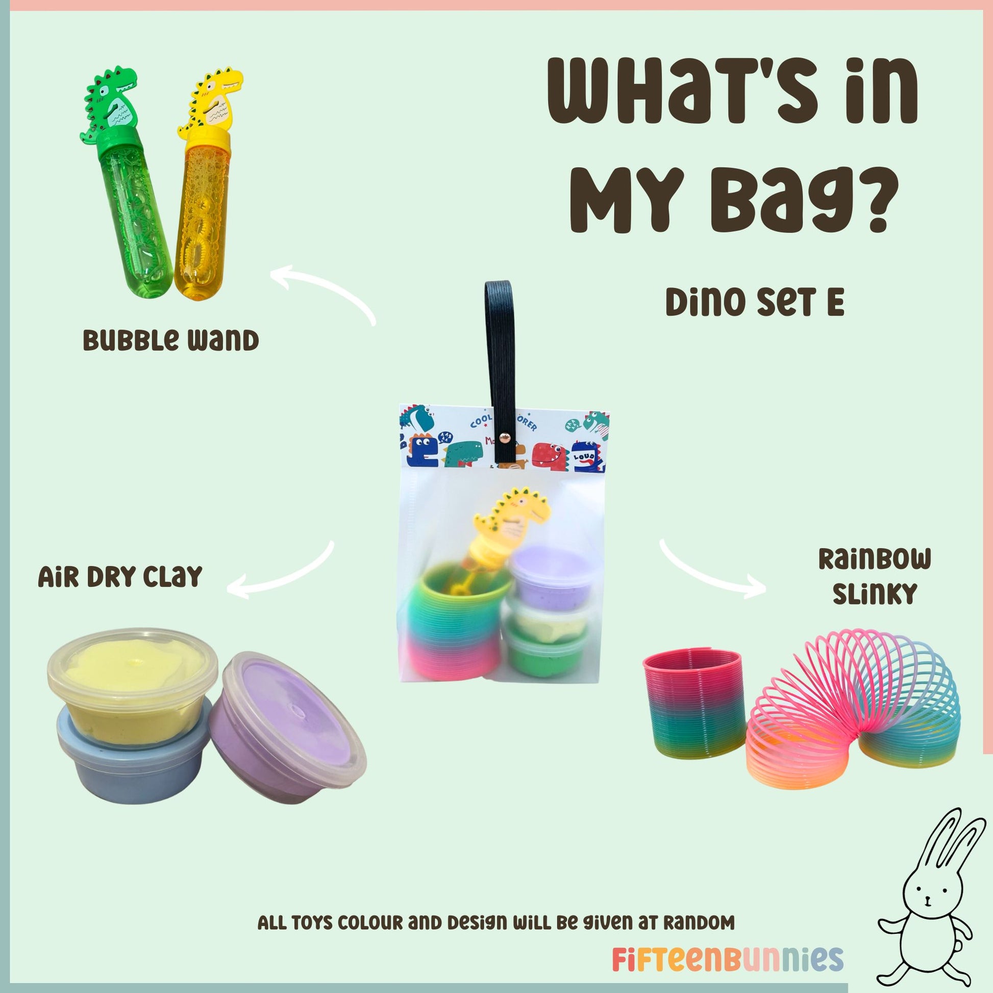 - Dino Bubble Wand, Rainbow Slinky and 3 Air Dry Clay for hours of creative play.